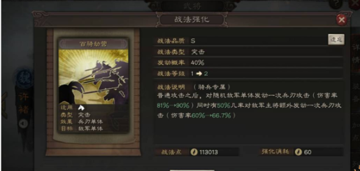 2、百骑劫营:在普通攻击之后会随机对单体敌军造成兵刃伤害,这个战法的特性就是会以锁敌有限攻击,并且造成两段伤害。搭配许褚的战法就可以有限的攻击许褚锁定的敌军了。