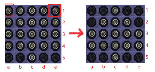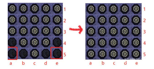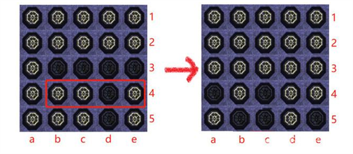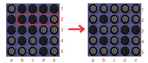5、需要再次回头把第一行的a、b、d、e四个灭掉,造成和第5行一样的布局。