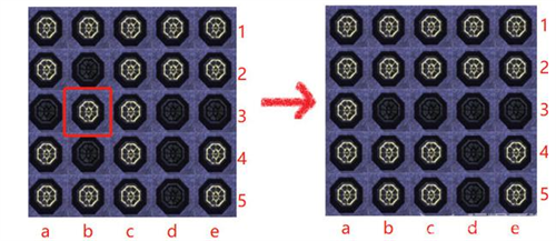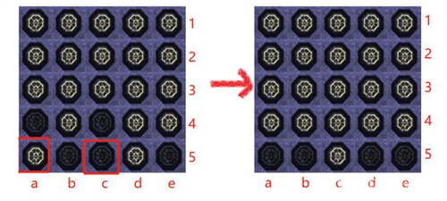 4、第4行,a、c两列灯灭,就去点第5行的a、c两列,把第4行全部点亮。