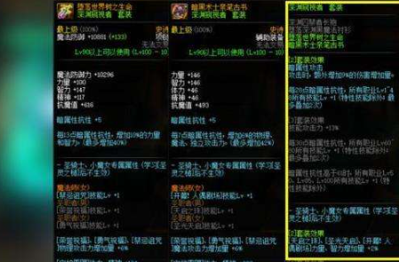 鞋子:增加2级一觉被动,BUFF提升4%的力智、被动增加263体精/163智力戒指:增加8%的BUFF力智,被动增加299体精/115智力;耳环:BUFF增加6%的技能攻击力,被动增加192体精/95智力;2件套:增加1级BUFF技能、一觉增加32力智;3件套:增加1级BUFF、2级一觉、BUFF增加6%力智、被动增加195体精/188智力;地狱求道者的着重点在与独立攻击力的增加,这一个让固伤职业获得了额外的加成。所以最后2个部位最理想的就是增加物理和魔法攻击力的【深渊窥视者】。