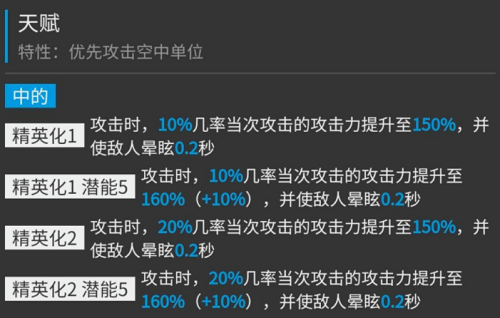 2、特性就是经典快狙的特色,优先攻击空中单位。天赋是攻击时,有一定概率打歌词攻击的攻击力提升,并让敌人进入短暂的晕眩