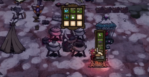 晾晒的肉架:是玩家把肉食放上面,过两天就可以收割大肉干。大肉干保质期很长有20多天,而且还能全面恢复玩家的理智和血量!烹饪锅是饥荒里面必备的东西,最常用的食物有肉丸子和饺子,一个用来填饱肚子,一个是可以为人物回复血了。接下来是科学栏,温度计是可以显示空气中的湿度来预测下雨,指针往右指说明空气的湿度越大,就要下雨了,避雷针是春季里家里必备的东西能保护两个屏幕不会遭到雷电攻击。而且避雷针被雷劈后会给自己充能发出微弱的光,晚上可以提供光源火药,堆叠起来可以瞬间制造极大的伤害。是不需要你怎么动手杀怪物,比较懒的方法,但是缺点就是他需要材料准备的周期很长,而且怪物如果被炸死的话,所有除了大肉以外掉落的物品,全部都会变成灰烬。