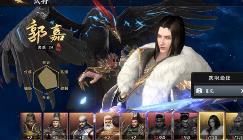 第二个便是郭嘉,郭奉孝。这个平民玩家也不容易获得,需要1k的累充才可以获得,资质20,也是很好的角色。