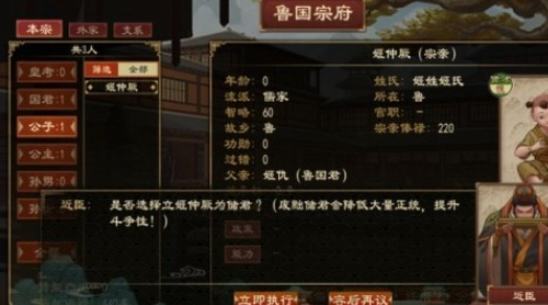 在 “都城-宫廷-儿女-人物详情” 中可以选择合适的子嗣进行立储, 废储将会产生负面影响 。