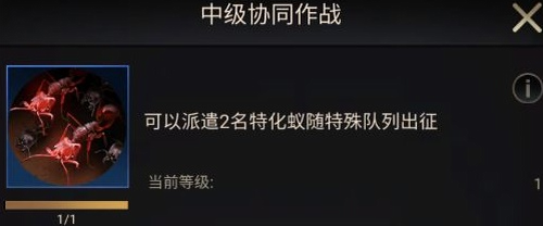 【行军队列I/II/III和特殊行军队列】的“中级协同作战”,能解锁2个特化蚁位置;对于有能力或者喜爱战争的玩家,建议进化出【特殊行军队列】的“高级协同作战”,上阵3个特化蚁,战力提升明显。