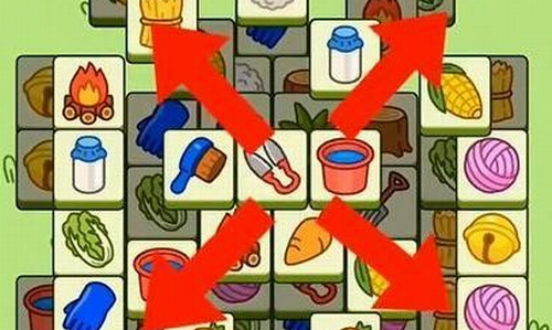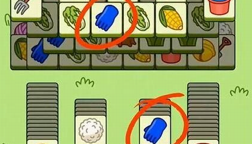 1、游戏开始后,千万不要急着去三消。我们要做的是从主牌区和副牌区内各选出一张相同的牌。这张被选的牌在主牌区内必须是第一层里面独一无二的牌。我们应该选择主牌区里仅有的手套,而不是水桶,如下图。