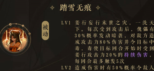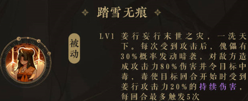 3:被动,踏雪无痕,每次受到攻击之后,傀儡有30%概率发动暗袭,对敌方造成攻击力80%伤害并且让目标回合开始的时候受到姜行攻击力20%的持续伤害,每个回合至多触发五次。