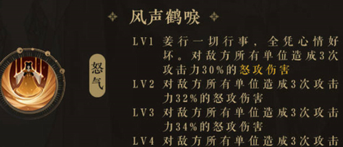2:怒气,风声鹤唳,对敌方全体造成三次攻击力的30%-40%的怒气伤害;