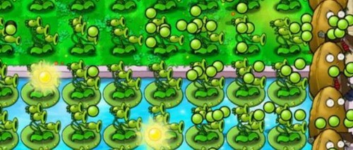 3、等待一切就绪之后我们就可以正式开始我们的游戏了,开始之后我们需要尽可能种多的莲叶以及三发豌豆射手来在水上布置我们的植物防线。