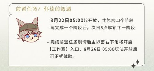 ※ 前置任务剧情[怀榛的初遇]将于8月22日05:00起开放,共包含四个阶段,每完成一个阶段后,次日5点解锁下一阶段。