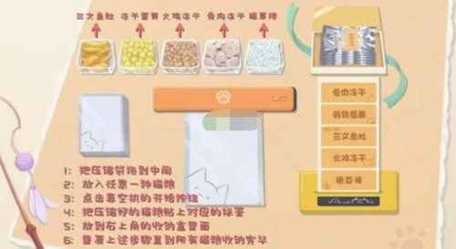 1、【猫粮分装】关卡首先要把压缩袋放在中间,然后将任意一种猫粮放进去
