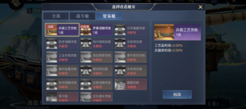 我们在建造船只以后,需要在船舱进行改造,这里的改造可以分为战斗和贸易两种舰队。战斗舰队的船舱改造可以增加各项战斗性能,比如高级火炮舱,可以增加船只高额攻击力;像医疗室则是增加船只受到的治疗效果属性加成,根据职业的需求,我们可以自由搭配。贸易舱可以增加交易属性,比如兵器工艺货舱,可以增加工艺品和兵器类物品的利润;而食品烟草舱则增加食品类和嗜好品类的利润,通过这些属性加成,贸易能力可以大幅度提升。