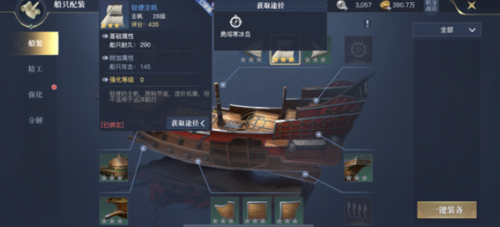 船装玩法里分为船装、精工、强化和分解四个玩法,首先看下船装。船装是给船只装备各种道具,比如船首,可以装备各种火炮、撞角和首楼,增加船只的攻击能力。在船身和船尾还可以装备对应的装备,可以提高船只的耐久、防御和各种抗性,这些属性可以大幅度提升船只的作战能力。获取方法上,可以从【勇者航路】、【勇闯寒冰岛】、【神秘梦境】等活动任务重获取。随着我们等级的提升,可以获取的船装也会越来越好,小伙伴记得及时更换新的船装。