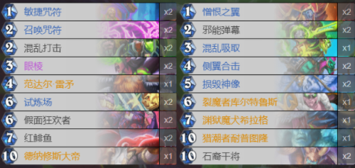 在昨天那个试炼场思路上有所改良进步,放弃了昨天让我很破防的杰斯,换了一批大哥带,不过核心还是要靠假面狂欢者拉石裔干将,猎潮者耐普图隆这些牌出来超展开一下,今天这个改良版本前期带了更多混子牌,召唤符咒和大小眼棱都是为了让恶魔猎手前期能稍微顶住一下对手的攻势。我觉得的卡组的一大亮点是带了范达尔·雷矛,这样就算不天胡试炼场胡雷矛也能直接当大哥瞎玩,算是多一个出路,红鲱鱼身材优秀带嘲讽12血拉出来决斗基本上死不掉,当回合可以掩护一下另外拉出来的大哥,如果你直接拉出来红鲱鱼+希拉格,说不定对手没有aoe可以偷一波大的伤害。