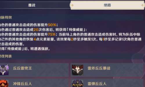 3、绝路强敌对应的是三波:两只雷斧丘丘暴徒、两只雷斧丘丘暴徒、一只雷斧丘丘暴徒+一只雷丘丘王;
