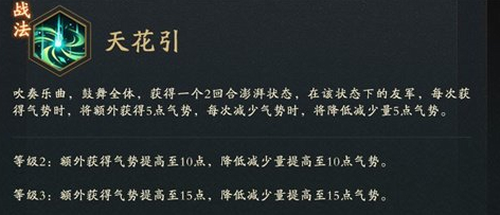 道教音乐《天花引》,相传为韩湘子所作。战法-天花引就是以此音乐使用发挥的,在战斗中,韩湘子吹奏乐曲,鼓舞全体,获得一个2回合澎湃状态,在该状态下的友军,每次获得气势时,将额外获得5点气势,每次减少气势时,将降低减少量5点气势。