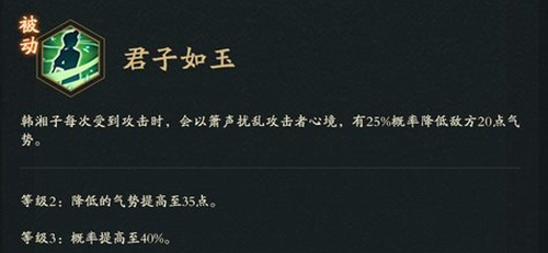 君子如玉兮,剑胆琴心。韩湘子每次受到攻击时,会以箫声扰乱攻击者心境,有25%概率降低敌方20点气势。