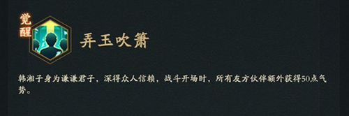 弄玉吹箫,有凤来仪!在战斗中,韩湘子会觉醒-弄玉吹箫的技能。他身为谦谦君子,深得众人信赖,战斗开场时,所有友方伙伴额外获得50点气势。