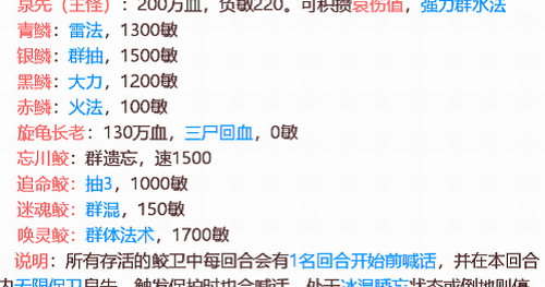 4、杀新版塔七一定要记住一点,上图的说明有提示,会有一个鲛卫无限保护主怪,但是回合开始前会喊话提醒,控上或者倒地当前喊话的就不会保护了,但是第二回合还会有喊话的,男人的作用就是一直控制喊话的鲛卫,龟丞相是不会保护的,但是他会回血,所以我们要抗三尸,叫对面回不起来状态。