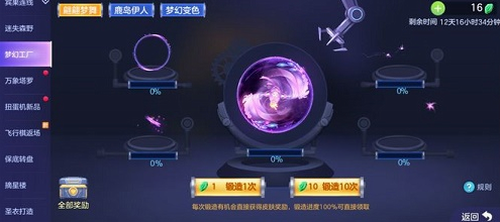 3、梦幻工厂主要是锻造的,锻造有几率会抽到皮肤等奖励,锻造进度达到100%的时候可以直接领取。
