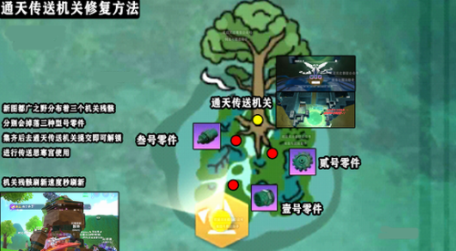 1、新图都广之野分布着三个机关残骸,分别会掉落三种型号零件,具体位置如下图所示: