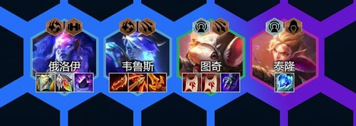 4.另一方面这套阵容搭配3冒险羁绊,泰隆增加阵容棋子攻击力,图奇增加阵容棋子攻速,这都可大幅度提升韦鲁斯的输出能力。而对局后期搭配2刺客羁绊泰隆直接化身强势输出副C,帮助韦鲁斯压低血线和定点斩杀。这套阵容另一个强势点在于控制衔接,奥恩、巴德与风暴羁绊连续控制形成控制链条,中间衔接韦鲁斯群控,敌方棋子大部分时候均在眩晕下,给我方输出C位争取更优质的输出环境,收益极高。装备搭配这套阵容对装备要求较高,特别是反曲与腰带需求较大。主要考虑韦鲁斯的输出装与俄洛伊的坦度装备。
