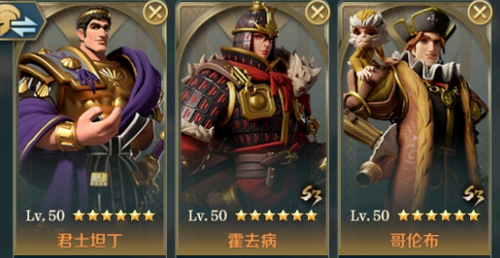 这套阵容的配队思路和前面的相似,不同的是该队以打爆发伤害为主,君士坦丁吸收伤害,并且为敌军提供负面状态——嘲讽。而哥伦布为霍去病带来高额属性增益,当霍去病对具有负面状态的敌人发动技能时可触发暴击效果,从而进行爆发输出。