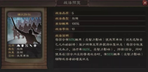 因为满宠是S8推出的武将,很多小伙伴对其还不太熟悉,我们先来看一下满宠的自带战法--镇扼防拒。指挥战法,50%概率(受智力影响)优先让除自己以外的副将(曹操说的就是你)援护所有友军,并回血。并且当其(曹操)受到普通攻击时候,还能移除攻击者的增益状态。