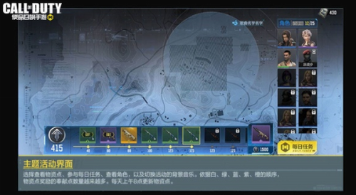2、在主题活动界面,战士们可以参与每日活动、查看角色,以及切换活动的背景音乐。依据白、绿、蓝、紫、橙的顺序,物资点奖励的奉献点数量越来越多。每天上午8点更新物资点。