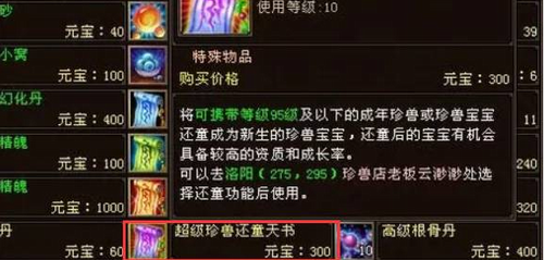 在列表中找到并购买道具【珍兽还童天书】,