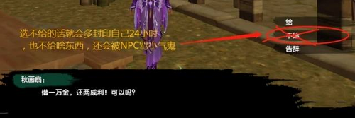 1、触发茶馆奇缘奇遇之后跟秋画扇对话,她会找你借一万金,不给秋画扇会消失。