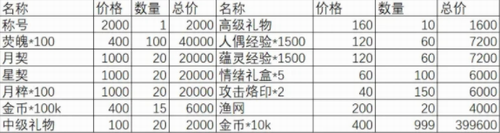 1、称号;荧魄;金币;星契;月契;月粹,合计:108000(十万八千)代币;