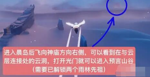 1、首先进入晨岛以后我们往神庙右侧飞过去,看到云洞再打开光门即可成功进入预言山谷中。