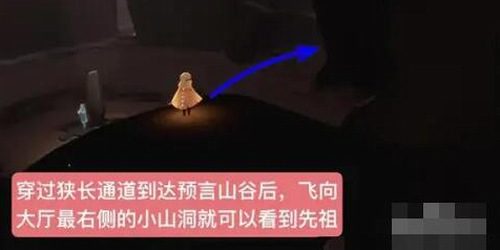 2、然后我们穿过通道到达预言山谷,飞到大厅最右侧的小山洞中即可看到火先知先祖。