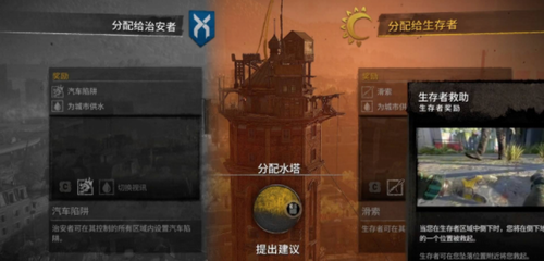 2、水塔的分配:如果分配给治安者,治安者则会在控制区域内设置陷阱等。如果分配给生存者,生存者会在控制区域内设置滑索等。分给不同派系触发的剧情会略微有所不同,但是风车一定会被炸。