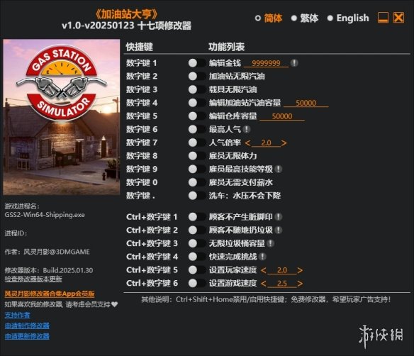 该修改器提供了十七项强大功能,包括编辑金钱、加油站无限汽油、载具无限汽油、编辑加油站汽油容量等,玩家可以更加轻松地发展加油站业务。