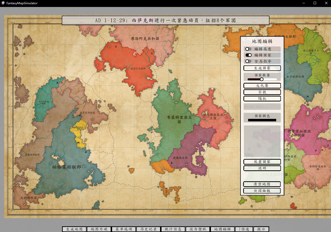 《架空地图模拟器》大陆上分布着众多国家,玩家可以静静的观察这些国家,这里将会模拟各个国家的外交、内政以及战争,主要用于模拟和创建虚构世界的地理、文化和政治环境。这款游戏通过其多样化的功能和灵活的操作,为玩家提供了一个深度定制和策略模拟的平台。