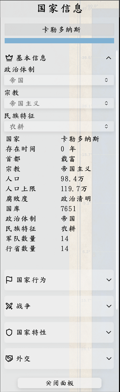 国家面板UI重制,新版UI分类更加清晰,包括基础、行动、战争、特质、外交、资源和历史七大类