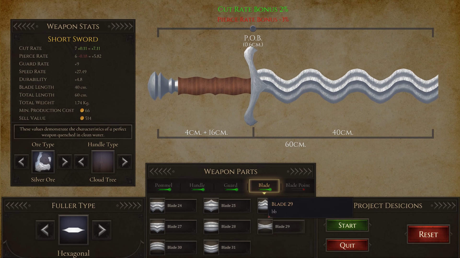 玩家可以设计和制作17种不同类型的武器,从匕首到长剑、双手剑到长矛,每种武器都有其独特的属性与用途。通过搭配不同的矿石和木材,以及调节重心和设计,玩家能够影响武器的切割、穿透力和重量。