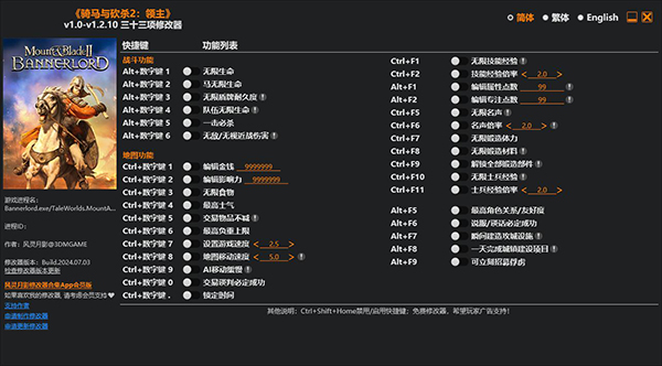 骑马与砍杀2修改器是针对同名游戏制作的游戏辅助修改工具。可以帮助玩家修改无限生命,马无限生命,无限盾牌耐久度,队伍无限生命,一击必杀,无敌/无视近战伤害等等多项修改功能。帮助玩家降低游戏难度,更好的体验游戏,欢迎下载使用!