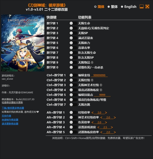 刀剑神域彼岸游境二十二项修改器使用教程