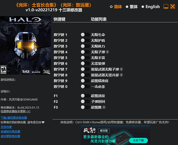 光环致远星修改器是一款专为第一人称射击游戏《光环致远星》所打造的多功能修改器,该修改器具有无限生命、无限护盾、无限子弹、无需装弹、快速射击等修改功能,可大幅度减低游戏难度,且修改器简单易用,玩家只需启动游戏、开启修改器即可进行修改。