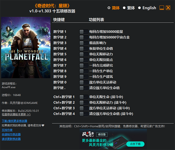 奇迹时代星陨修改器是一款专为太空科幻背景的RTS游戏《奇迹时代:星陨》所打造的多功能修改器,它能够为玩家提供每回合增加50000能量、恢复单位生命值、单位无限移动力、单位无限技能点等十五项无敌功能,能够大大降低游戏难度,增加游戏乐趣,且修改器简单易用,玩家只需启动游戏、开启修改器即可进行修改!