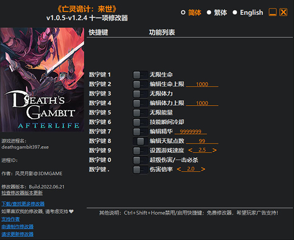 亡灵诡计修改器是一款针对横版卷轴动作冒险游戏《亡灵诡计》而制作的修改辅助工具,由风灵月影制作,这款修改器拥有无限生命、无限体力、无限能量、编辑精华等修改功能,是一款功能非常强大的修改器工具,可以让玩家更好地体验游戏,带给玩家不一样的战斗冒险之旅。