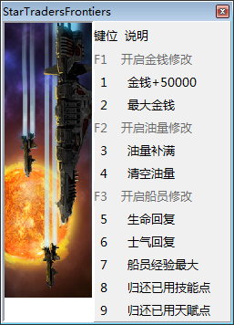 星际贸易前沿修改器是专为大型星际题材角色扮演游戏《星际贸易: 前沿》所提供的一款辅助修改工具,该软件界面简洁,操作方便,能够为用户提供一键实现开启金钱+50000、归还已用技能点、生命回复等功能,让你在星际之间自由的飞翔贸易,做全宇宙的金钱帝王,无需在为资源方面所担忧!有需要的玩家欢迎下载使用。