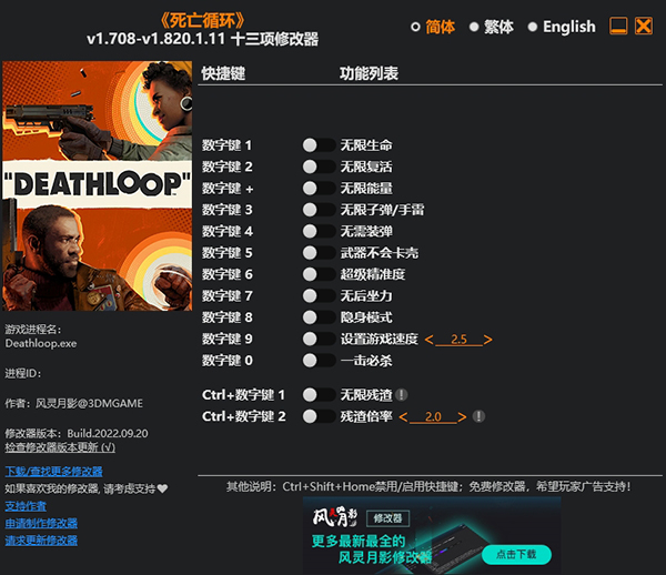 死亡循环修改器是一款专为《死亡循环》电脑游戏所打造的游戏辅助工具,该修改器支持无限生命,能量,子弹,秒杀等多项修改功能,让你可以轻松应对挑战,有需要的朋友千万不要错过这款好用的修改器,快来下载吧!