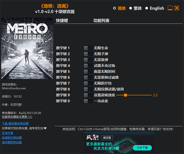 地铁离去修改器是针对大型第一人称射击游戏《地铁:离去》而推出的一款多功能辅助修改工具,它可以帮助玩家对游戏进行修改,如无限生命、无限子弹、无限装弹、无限医疗包等修改功能,助你轻松干掉剧情敌人,完成角色主线任务!