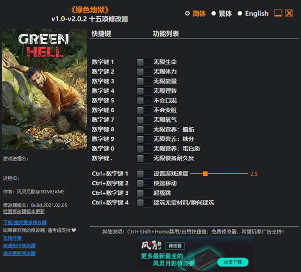 绿色地狱修改器是一款专为《绿色地狱》电脑游戏所打造的游戏辅助工具,该修改器功能强大,便捷实用,能够让玩家一键获取无限生命、无限体力、无限能量、无限励志、无限营养、无限装备耐久度等强大的游戏属性,轻松帮助玩家们求生和找到出路,简简单单即可摆脱困境和危险。