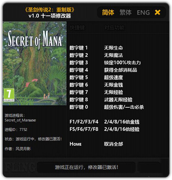 热键:效果数字键1 - 无限生命数字键2 - 无限魔法数字键3 - 锁定100%攻击力数字键4 - 获得全部消耗品数字键5 - 超级速度数字键6 - 无限金钱数字键7 - 无限经验数字键8 - 武器无限经验数字键0 - 超级伤害/一击必杀F1/F2/F3/F4 - 2/4/8/16倍金钱F5/F6/F7/F8 - 2/4/8/16倍经验Ctrl+Home - 取消全部修改器怎么用?
