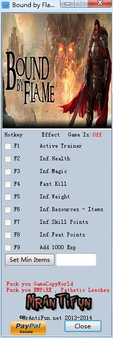 F1 无限生命F2 无限魔法F3 快速击杀F4 无限重量F5 无限资源F6 无限项目F7 无限技能点F8 无限特点F9 增加1000经验设置最小项目使用说明
